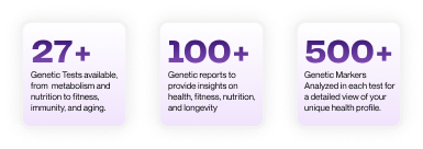 We use advanced genetic testing to unlock the secrets of your DNA. Our analysis uncovers the unique traits inyour health profile, enabling us to create personalized plans for your nutrition, fitness, and lifestyle. With expertguidance and lifetime updates, you can optimize your health and feel your best.