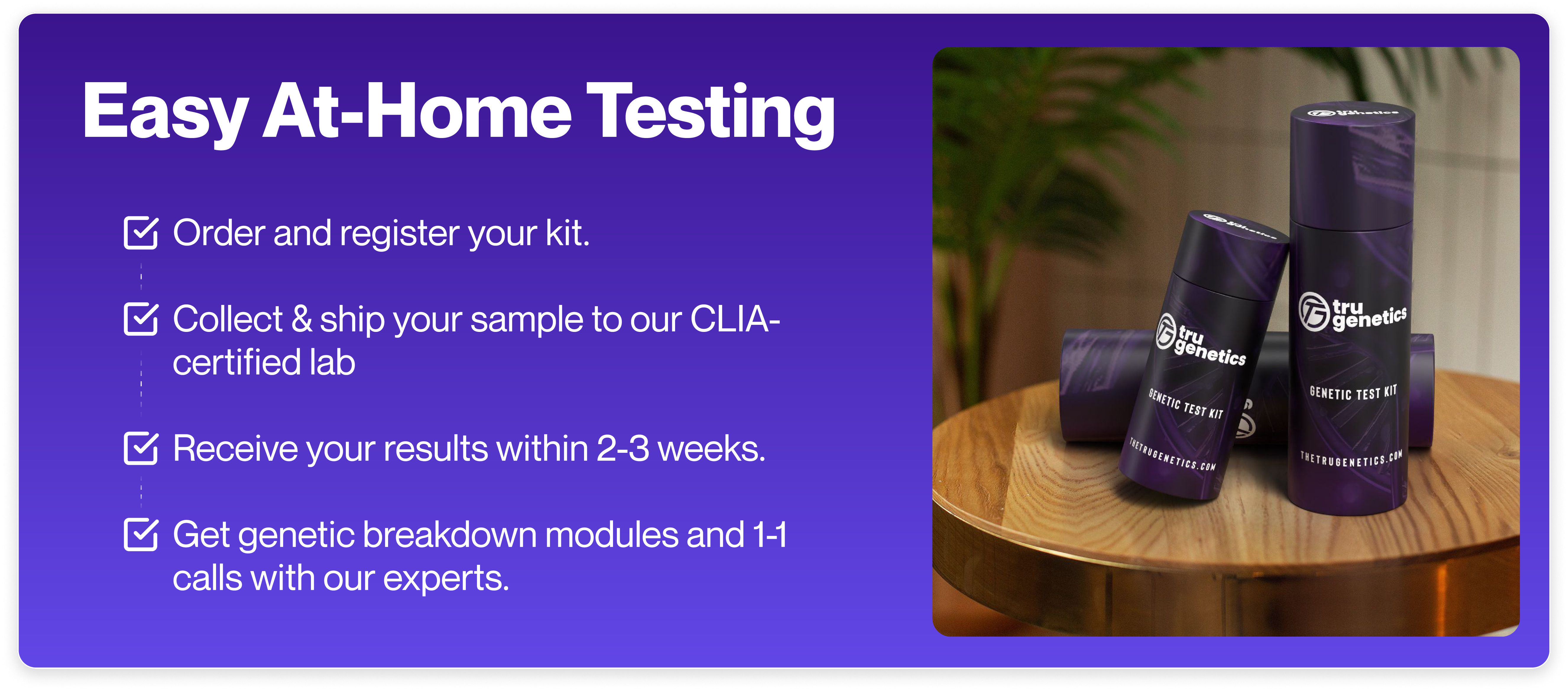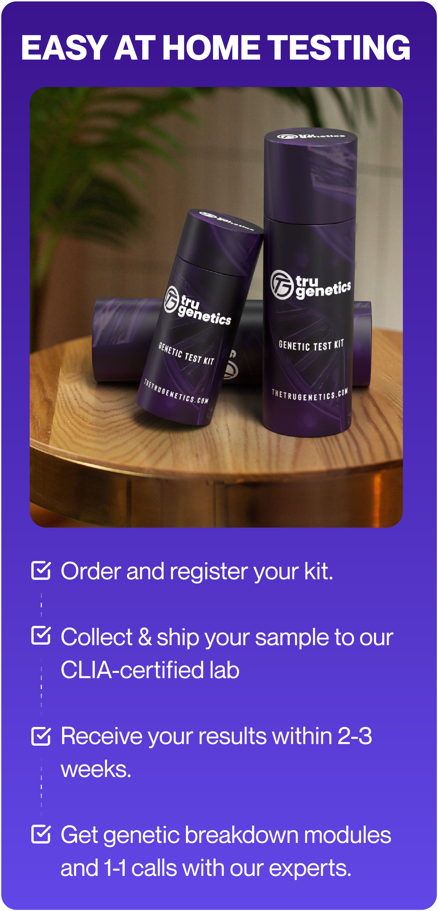 Our testing process is simple! You provide a small sample (like a saliva swab), which we analyze to unlock thousands of insights from your DNA. Your results are delivered in an easy-to-understand report via our app.